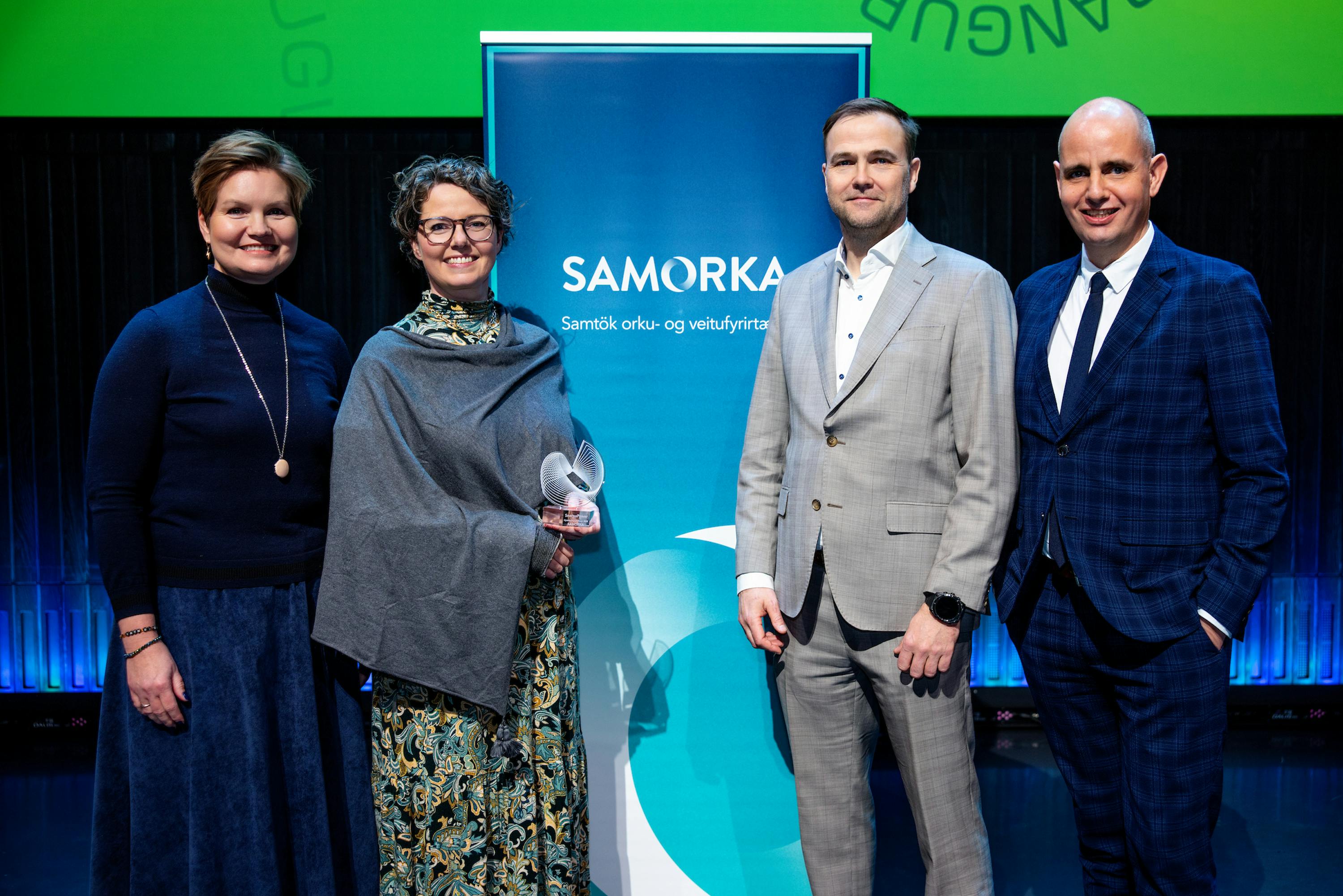 Íris Baldursdóttir og Eyrún Linnet, stofnendur SnerpaPower, veittu verðlaununum viðtöku af Magnúsi Kristjánssyni, forstjóra Orkusölunnar og varaformaður stjórnar Samorku. Óháð dómnefnd fagfólks úr orku og veitugeiranum valdi SnerpuPower úr hópi tilnefninga til verðlaunanna.